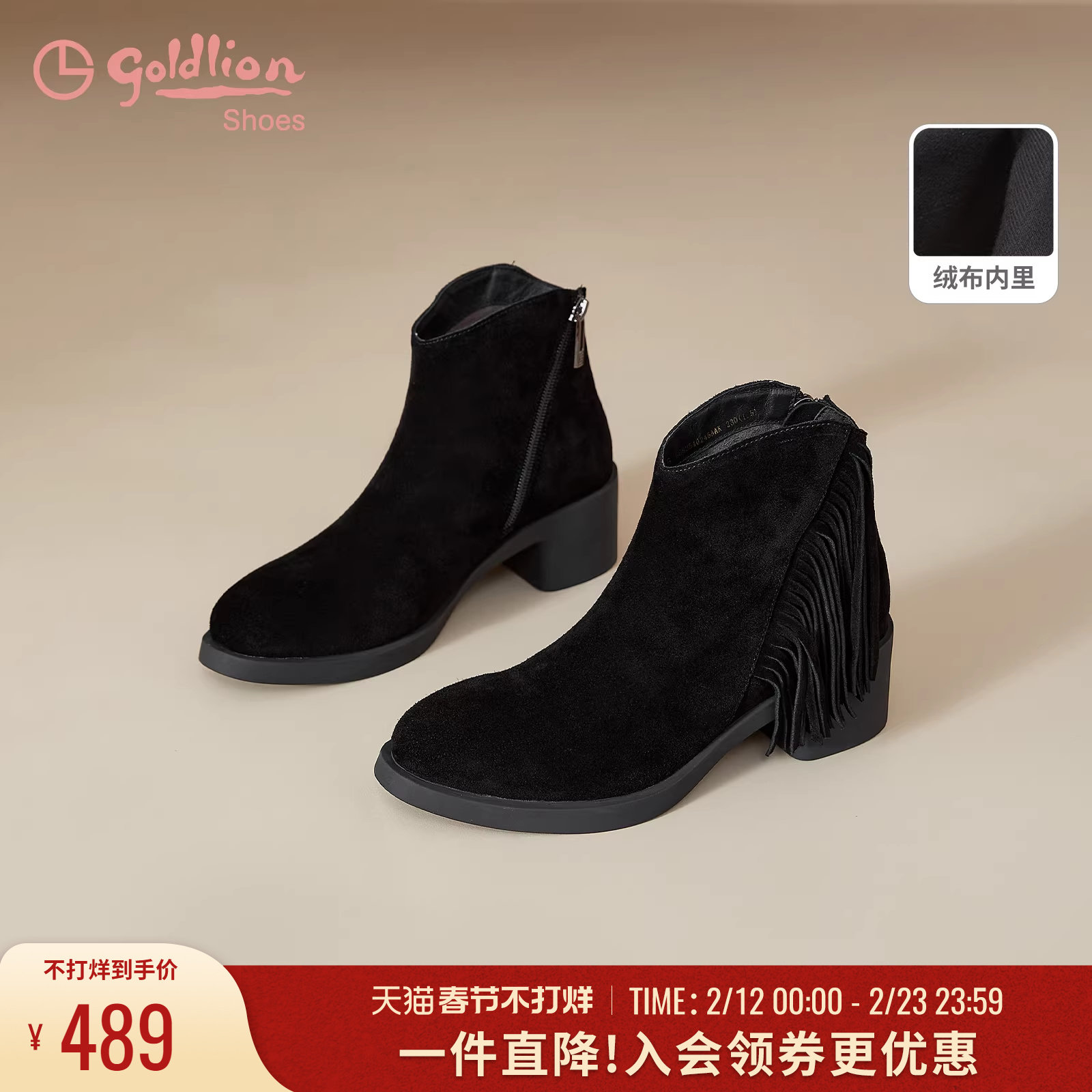 金利来女鞋2025秋冬新款磨砂皮流苏短靴女粗跟通勤保暖加绒时装靴