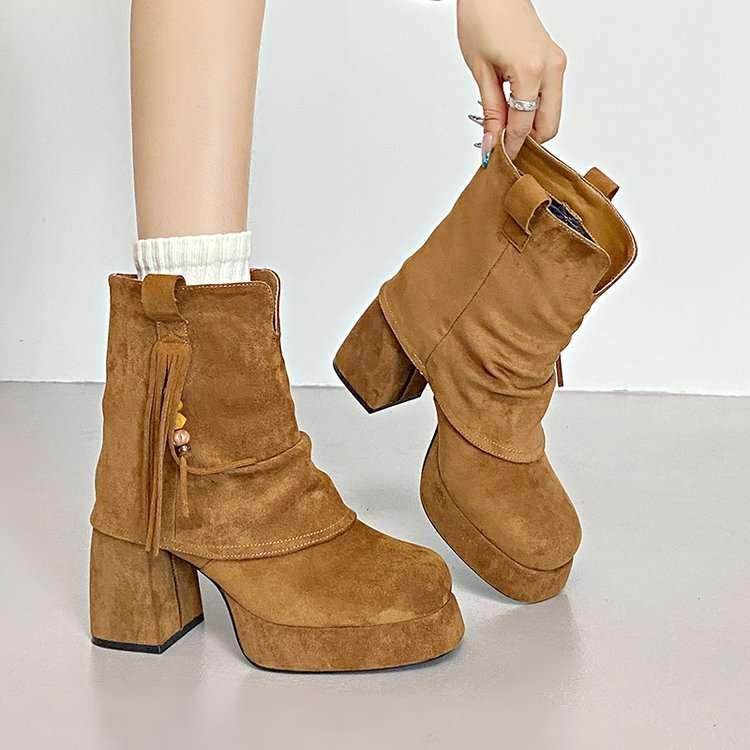 断码撤柜厚底流苏短靴女2025秋冬新款覆古高跟鞋粗跟马丁靴瘦瘦靴