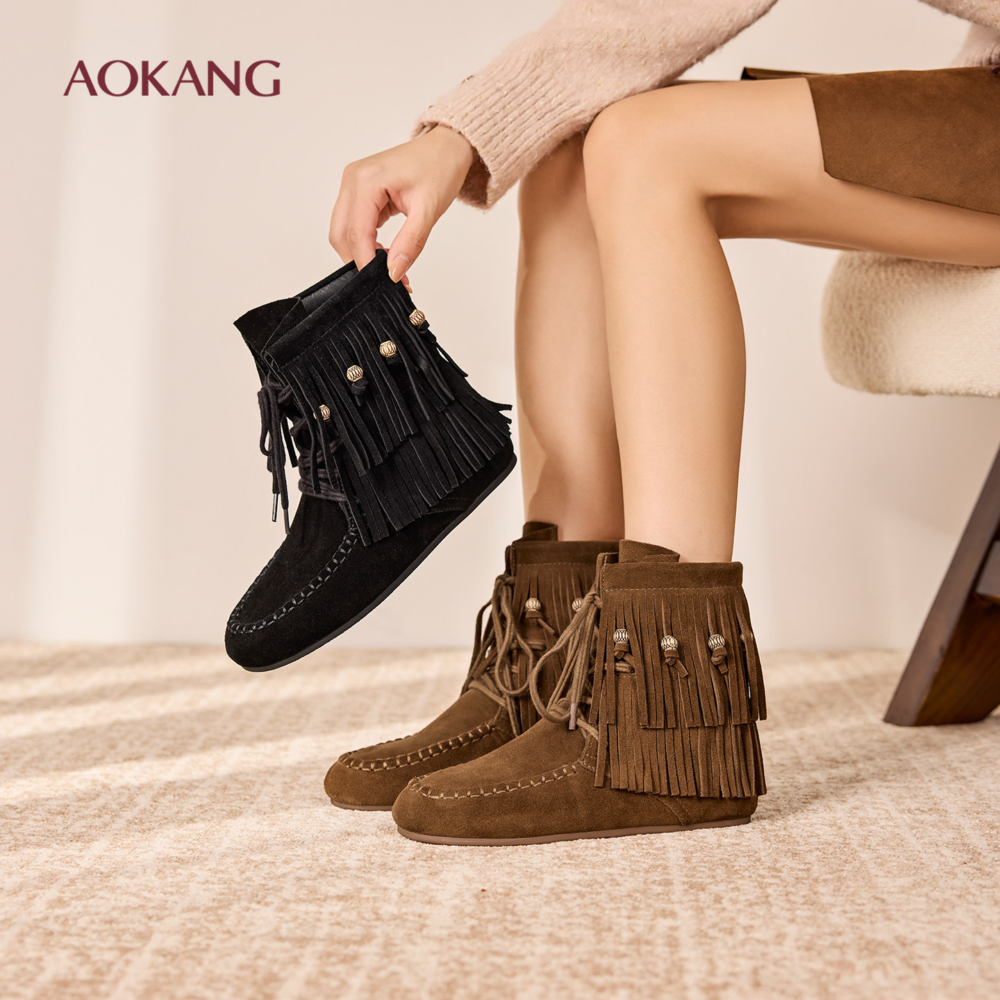 奥康 女鞋2025冬季新款流苏短靴驼铃靴女美拉德中筒靴西部靴