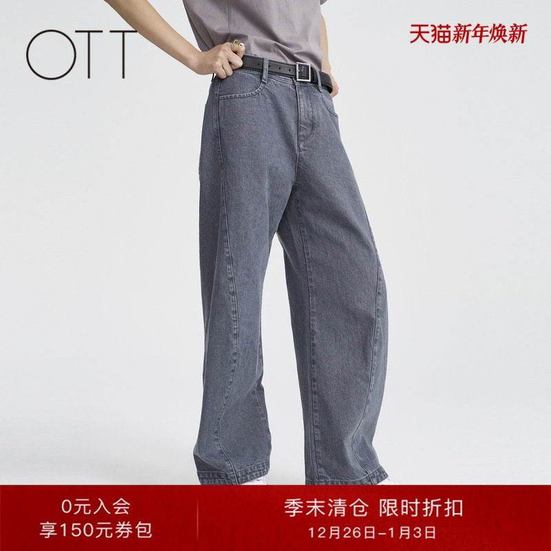 OTT【商场同款】春季新款灰色牛仔裤女复古水洗休闲裤宽松弯腿裤