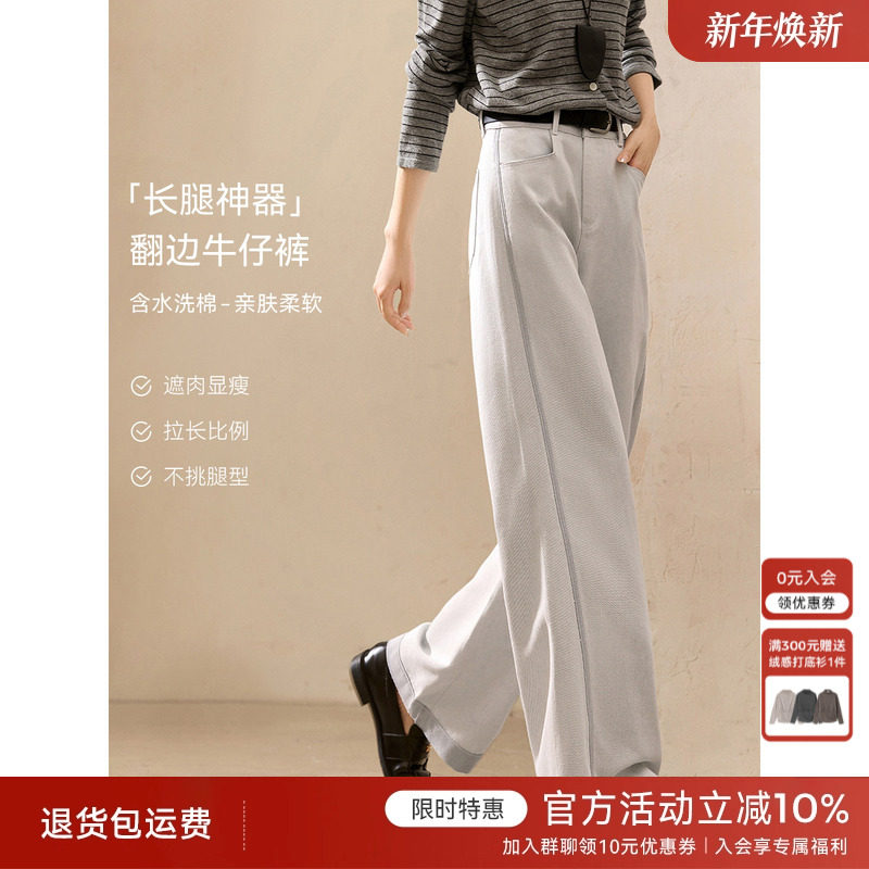 XWI欣未复古水洗撞色翻边灰色牛仔裤女秋季显瘦不挑人直筒阔腿裤