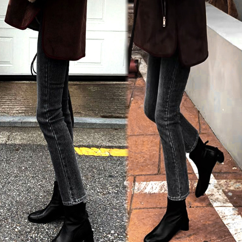 长腿压迫感!~黑灰色四面弹微喇叭牛仔裤女加绒高腰修身显瘦长裤