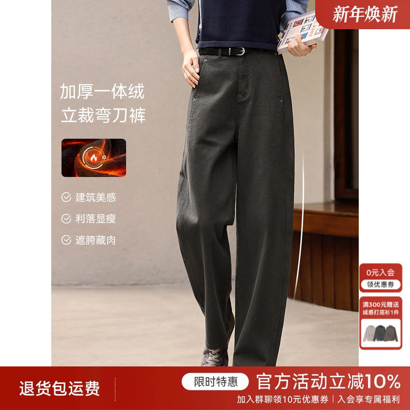 XWI欣未含棉复古经典百搭灰色牛仔裤女冬加绒加厚高腰直筒弯刀裤