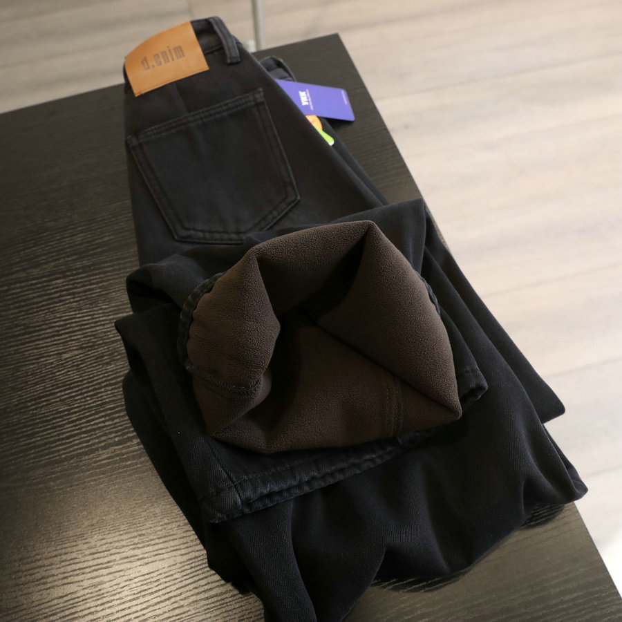 李李服饰加绒黑灰色牛仔裤女2025冬季新款高腰不贴腿显瘦微喇长裤