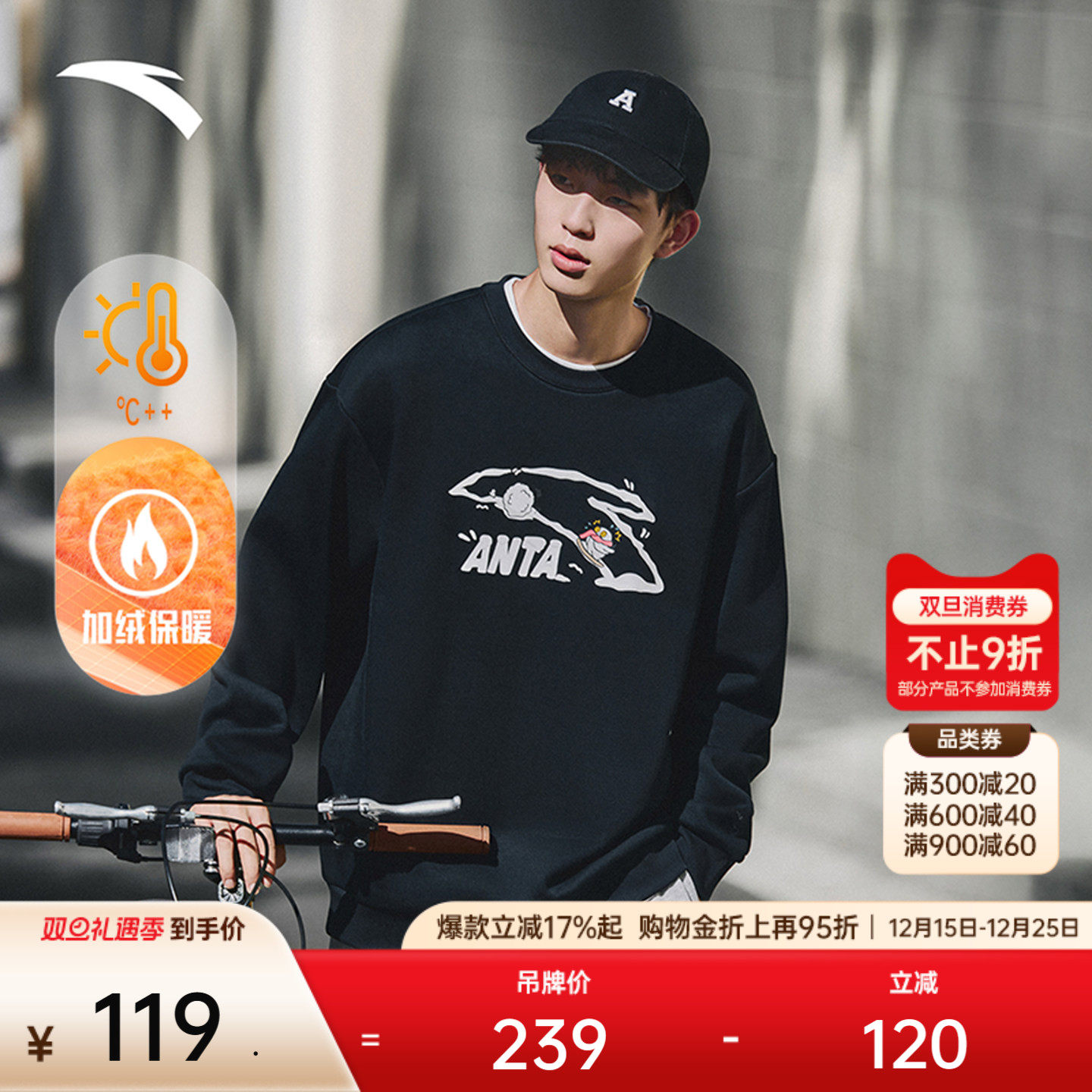 安踏加绒圆领卫衣男2025冬季新款趣味印花潮流宽松长袖上衣套头衫