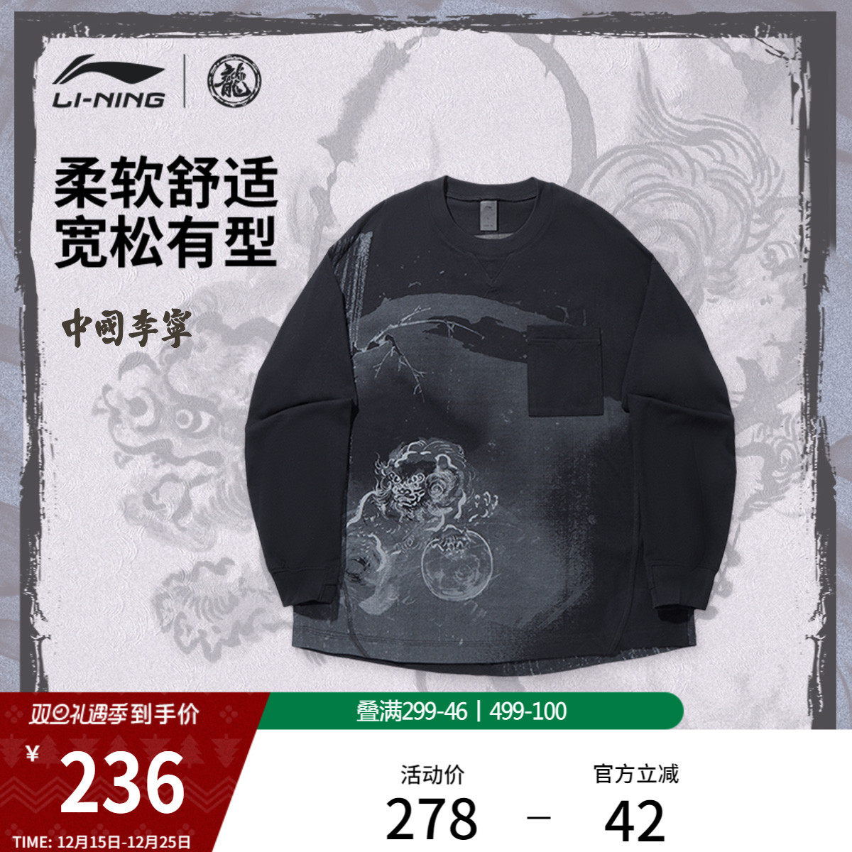 中国李宁长袖T恤男官方新款男装上衣冬季卫衣宽松圆领无帽运动服
