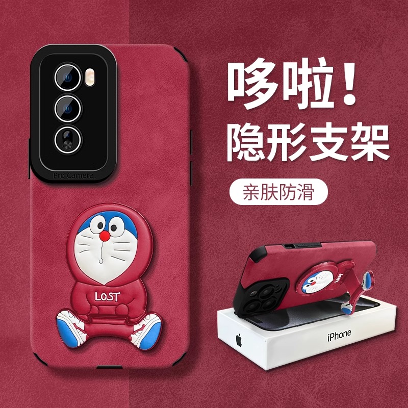 适用OPPOreno13新女款新年酒红色手机壳Reno12por哆啦支架可折叠11/10翻毛皮全包防摔高级防指纹手汗保护套