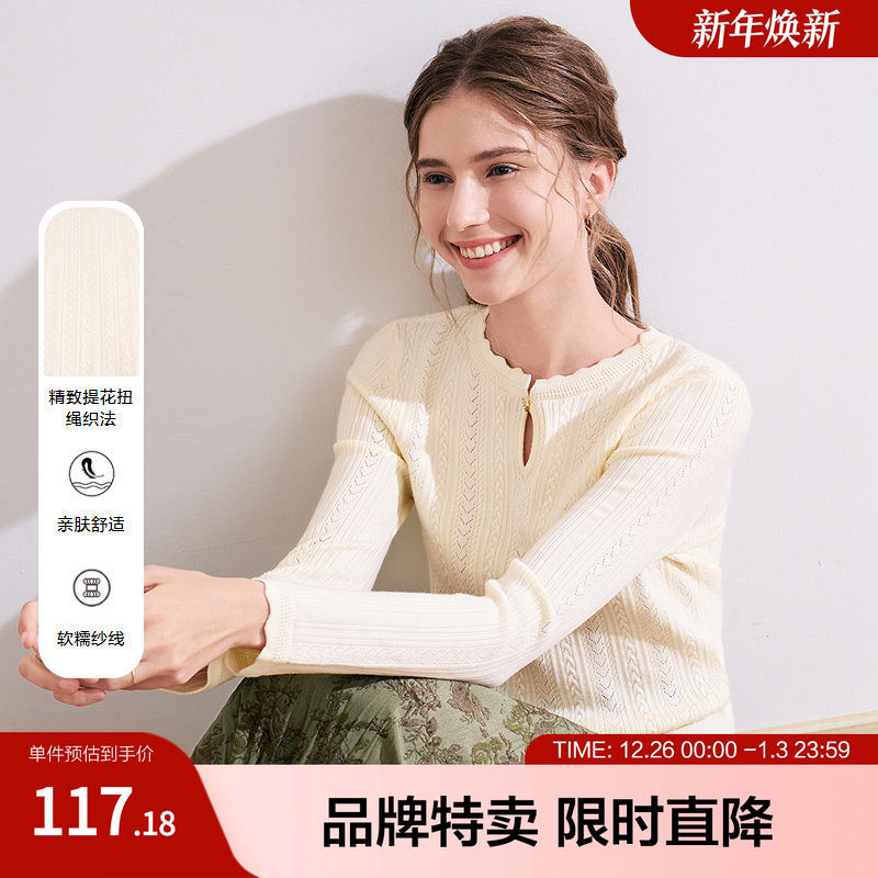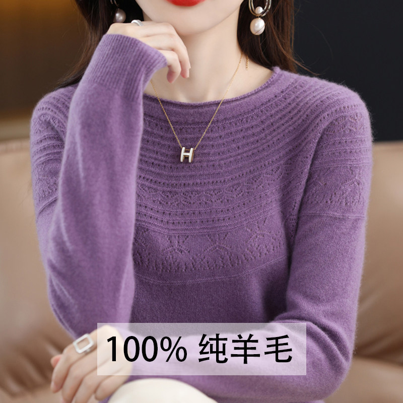一线成衣100纯羊毛衫女圆领秋冬新款镂空套头毛衣显瘦针织打底衫