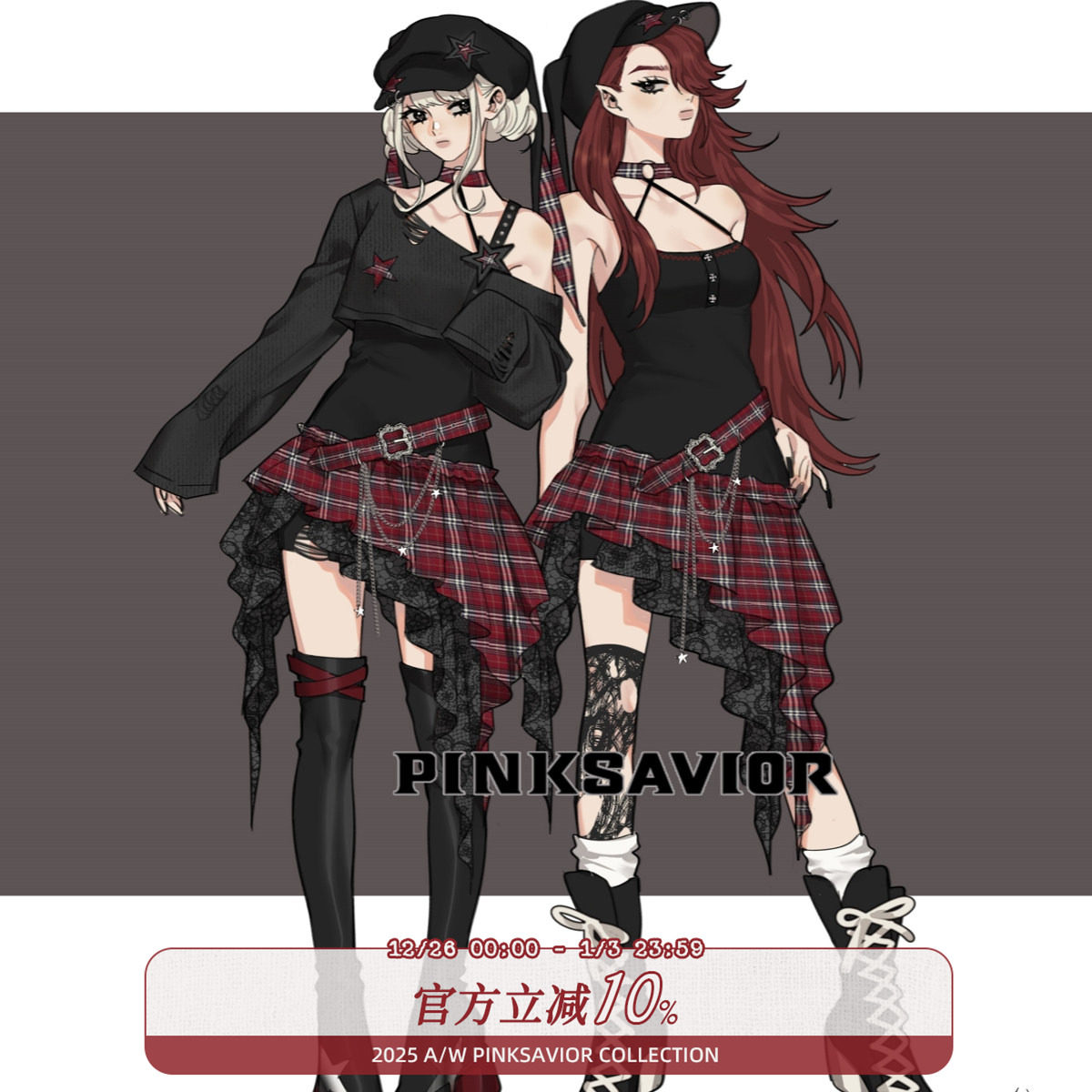 pinksavior【梦野】摇滚少女感设计挂脖格纹拼接连衣裙镂空套头衫