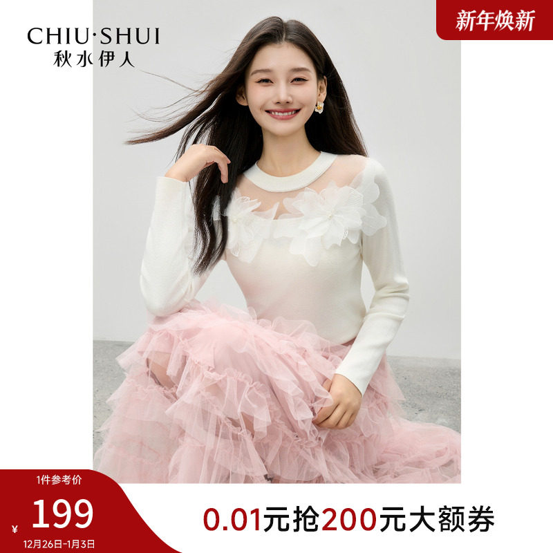 秋水伊人镂空套头毛针织衫 2025秋冬新款女装优雅风网纱拼接上衣