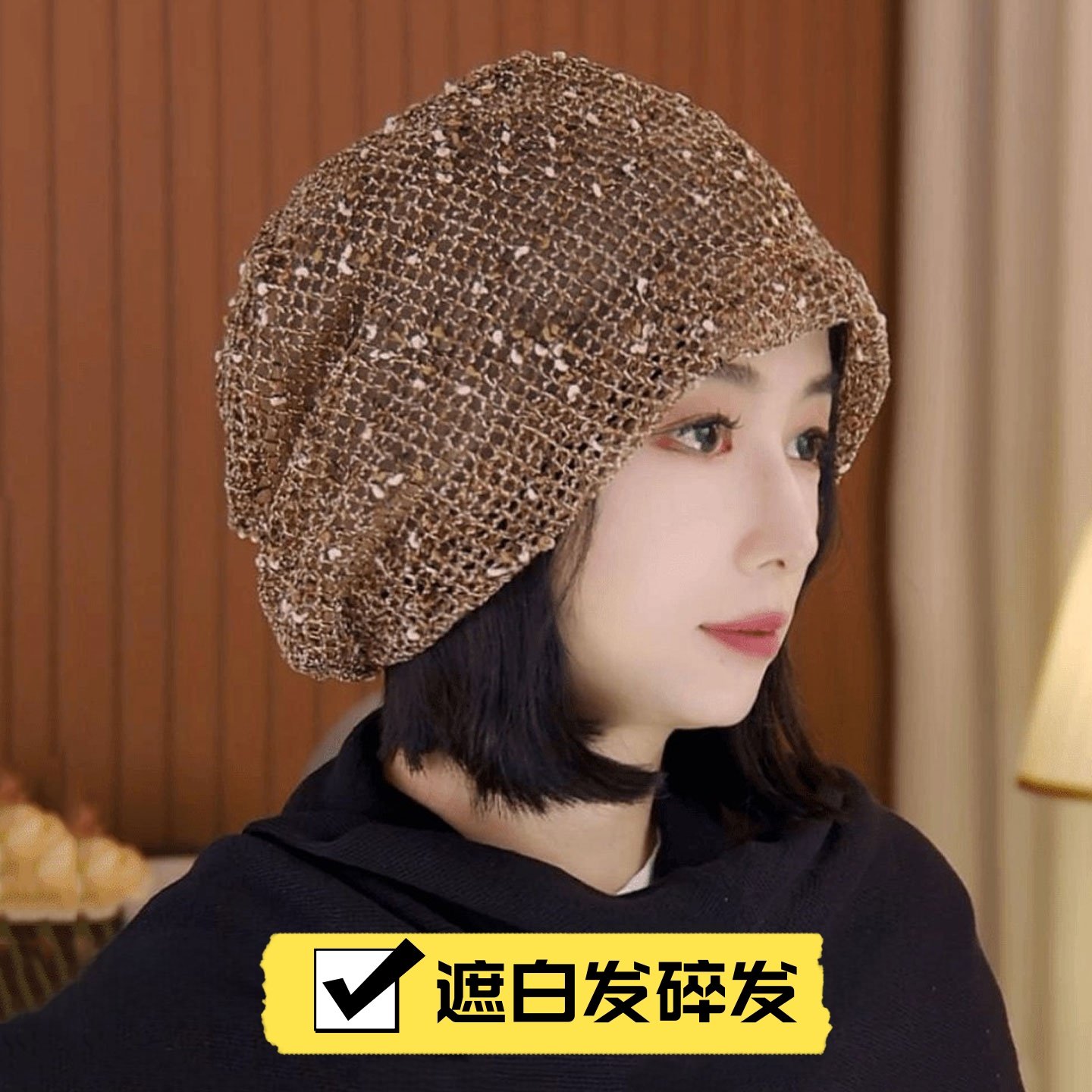 女士针织帽单层网眼包头帽镂空套头帽透气堆堆帽薄款休闲帽子洋气