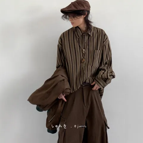 春秋日系复古穿搭整套条纹长袖衬衫男女生宽松百搭学院风衬衣全套