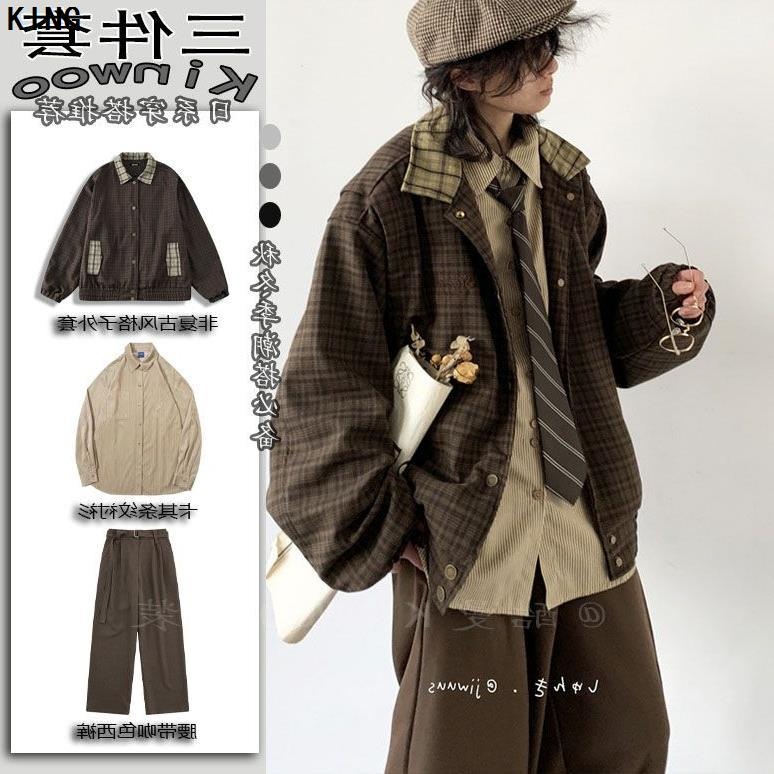 两件装/单件春秋日系复古长袖格子衬衫男女生宽松学院风中性衬衣