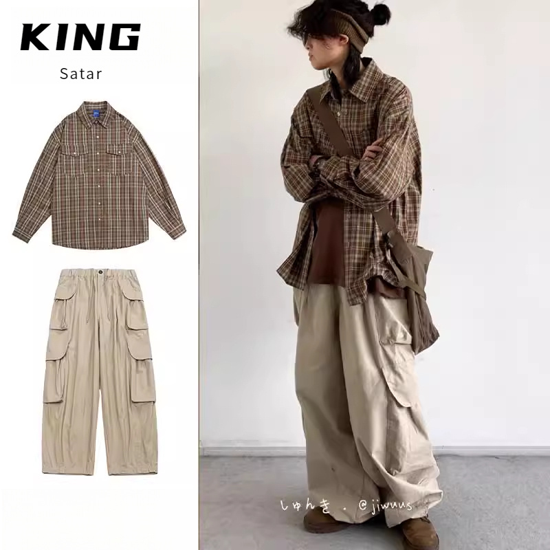 美式休闲咖色格子衬衫外套男女生学院风衬衣简约宽松复古长袖上衣