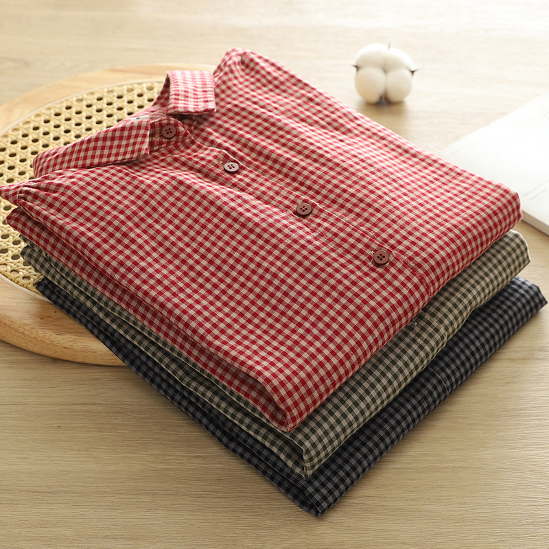 2025秋季新款小格子双层棉纱长袖衬衫女宽松百搭文艺纯棉柔软衬衣