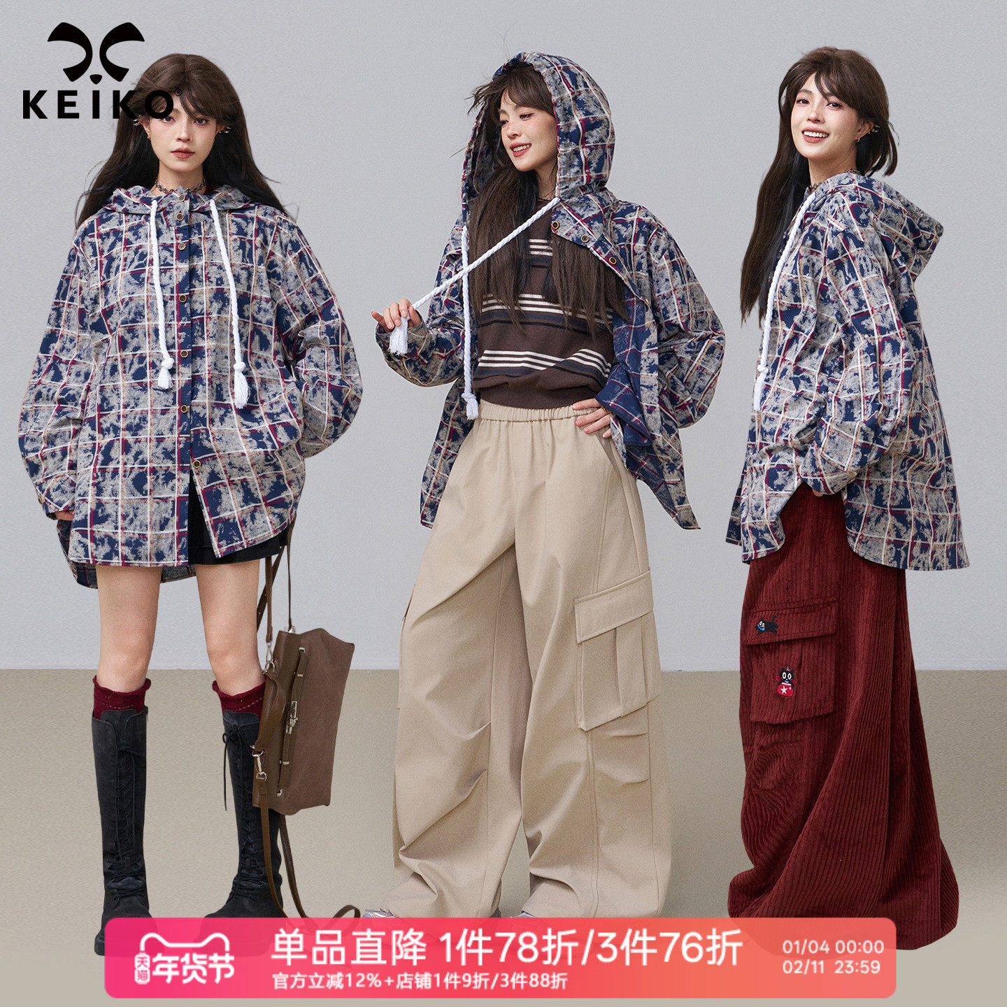 KEIKO 美式复古扎染全棉格子长袖衬衫女春季挺括量感宽松连帽外套