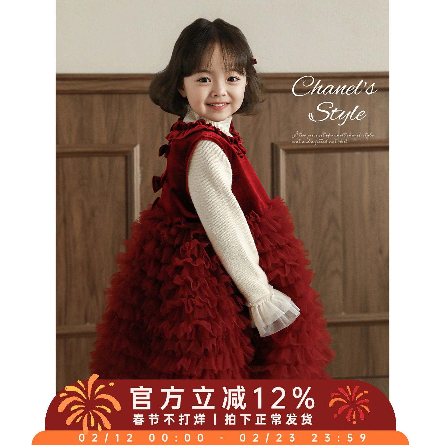 幼悠女童2025冬季新款加绒加厚背心连衣裙保暖过年服女孩蛋糕塔裙
