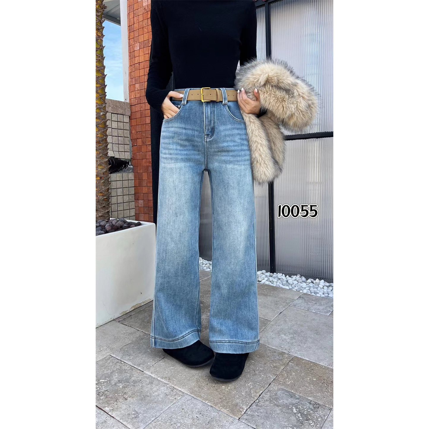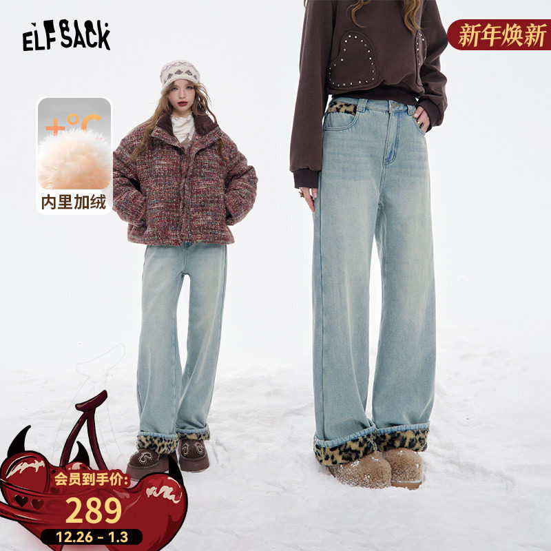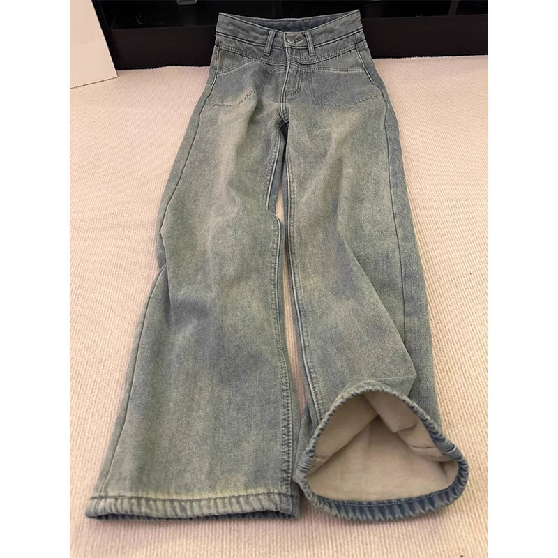 - 加绒牛仔裤女 高腰 直筒