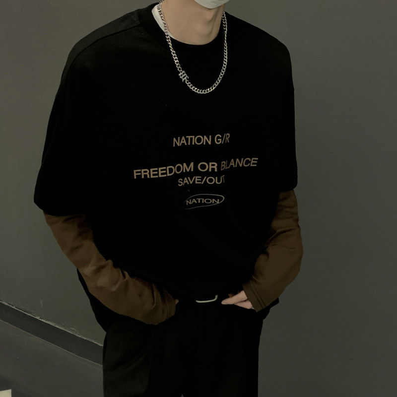秋季2024新款潮牌280克双纱重磅假两件长袖体恤男拼接印花T恤衣服