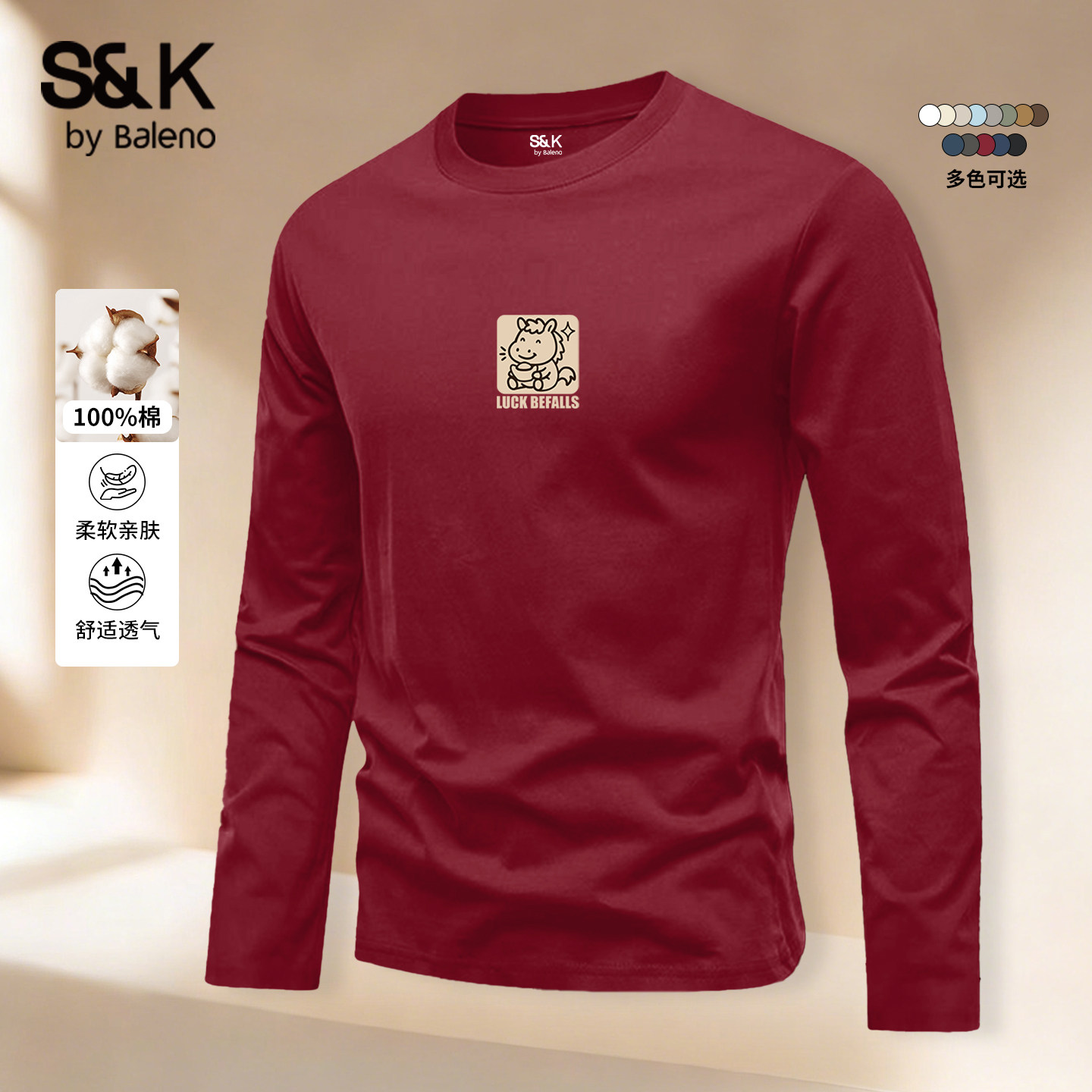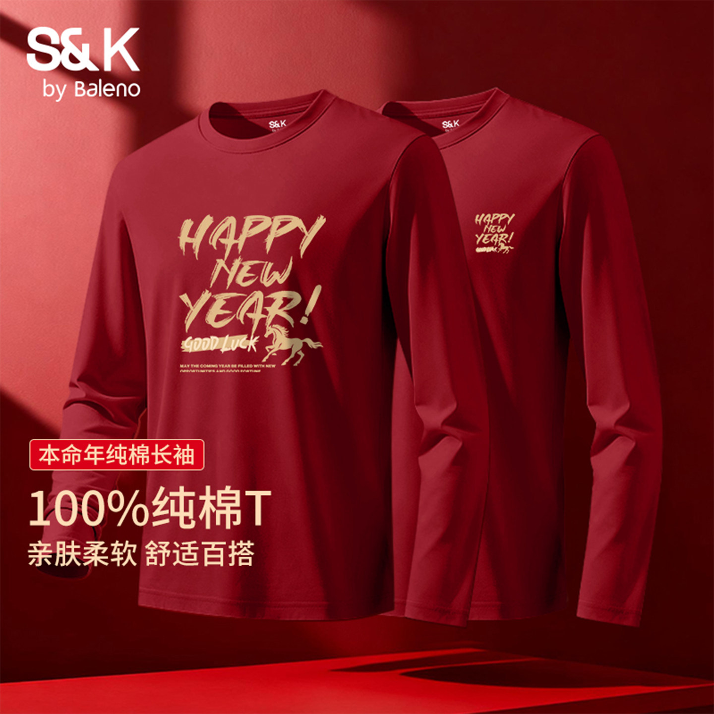 班尼路S&K系列红色纯棉长袖体恤男士2026新款马年本命年衣服男LF