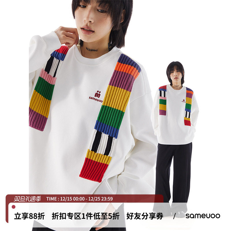 sameuoo散养文化设计感彩虹毛织拼接卫衣女秋冬中性重磅圆领上衣