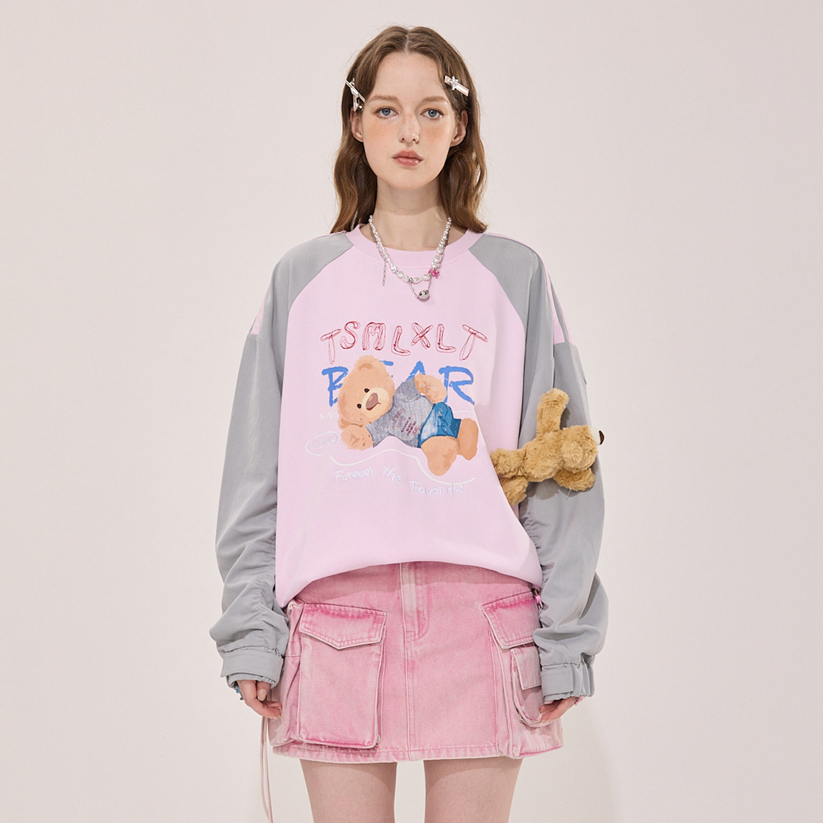 TSMLXLT小熊玩偶套头拼接卫衣女25春夏新品时尚圆领双色上衣情侣