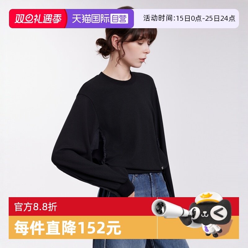 【自营】ELLE黑色设计感抽绳拼接卫衣女2025春季新款时髦通勤上衣
