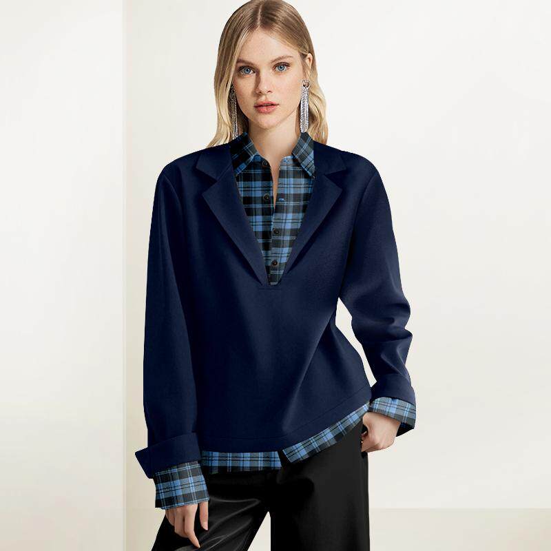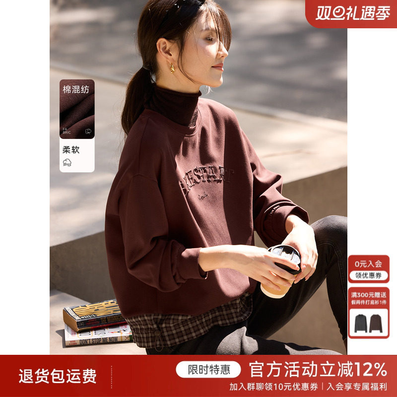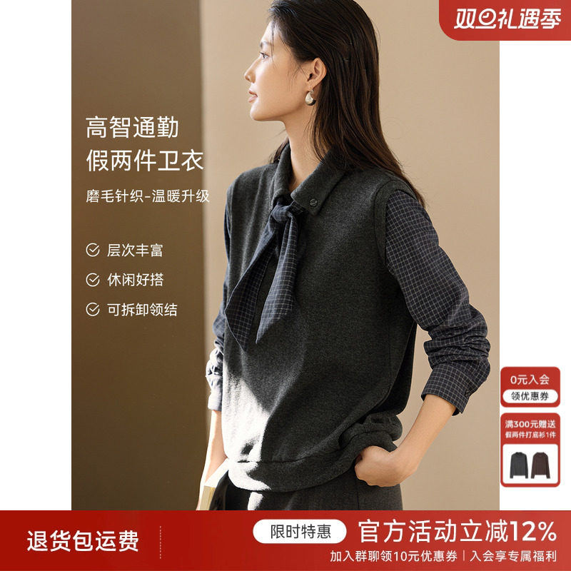 XWI欣未知性优雅假两件格纹拼接卫衣女秋冬新款保暖磨毛通勤上衣