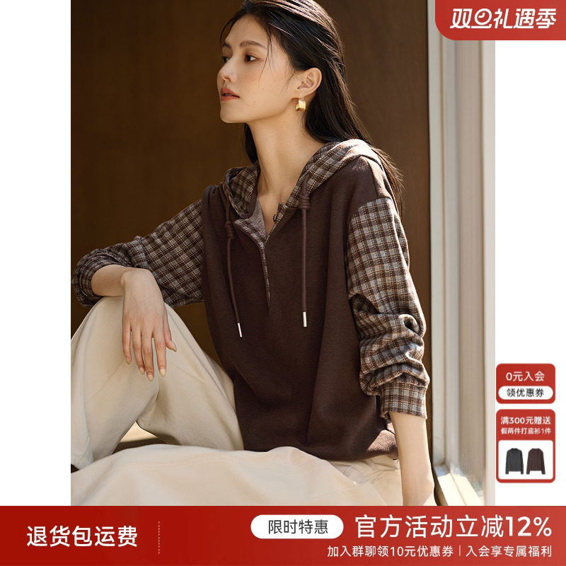 XWI欣未复古假两件格纹拼接卫衣女2025秋冬新款加厚磨毛连帽上衣