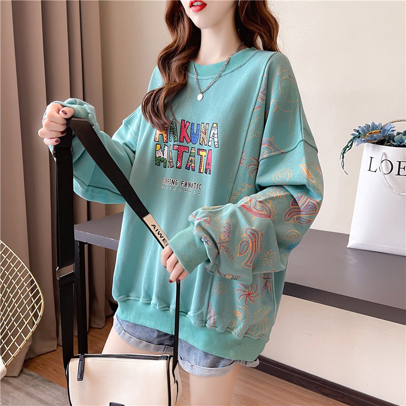 兔子刺绣拼接卫衣女新款2023爆款无帽圆领宽松薄款插肩袖上衣春秋