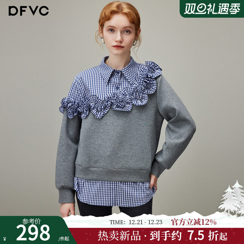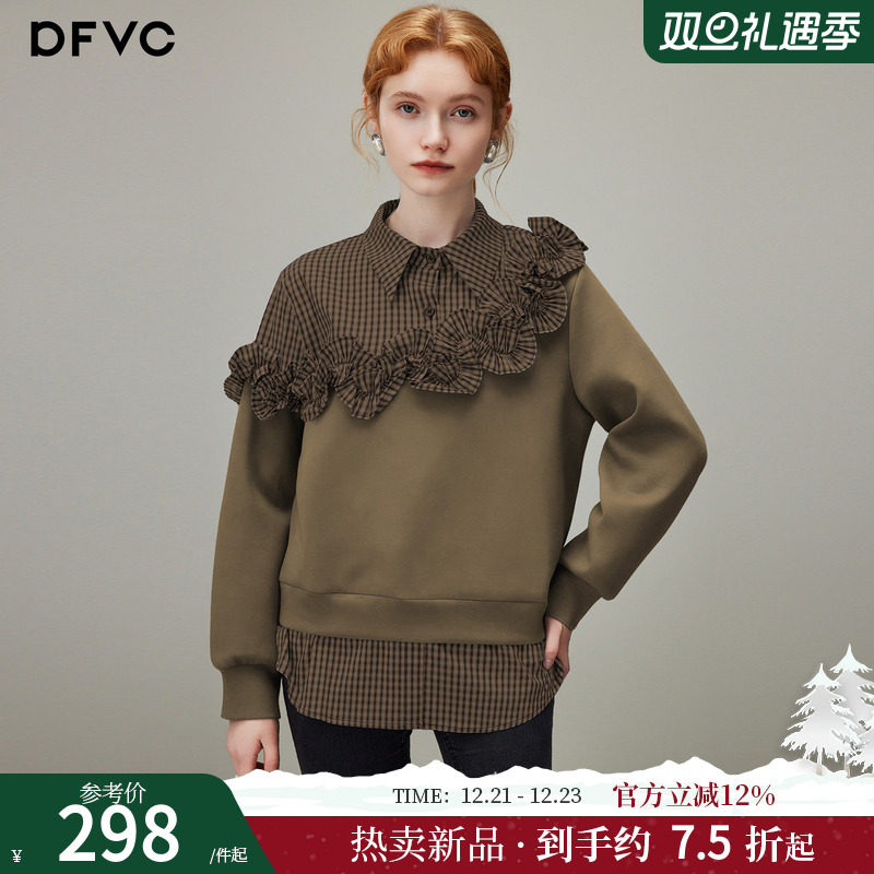dfvc设计感假两件格子衬衫拼接卫衣女2025年冬季新款短款休闲上衣