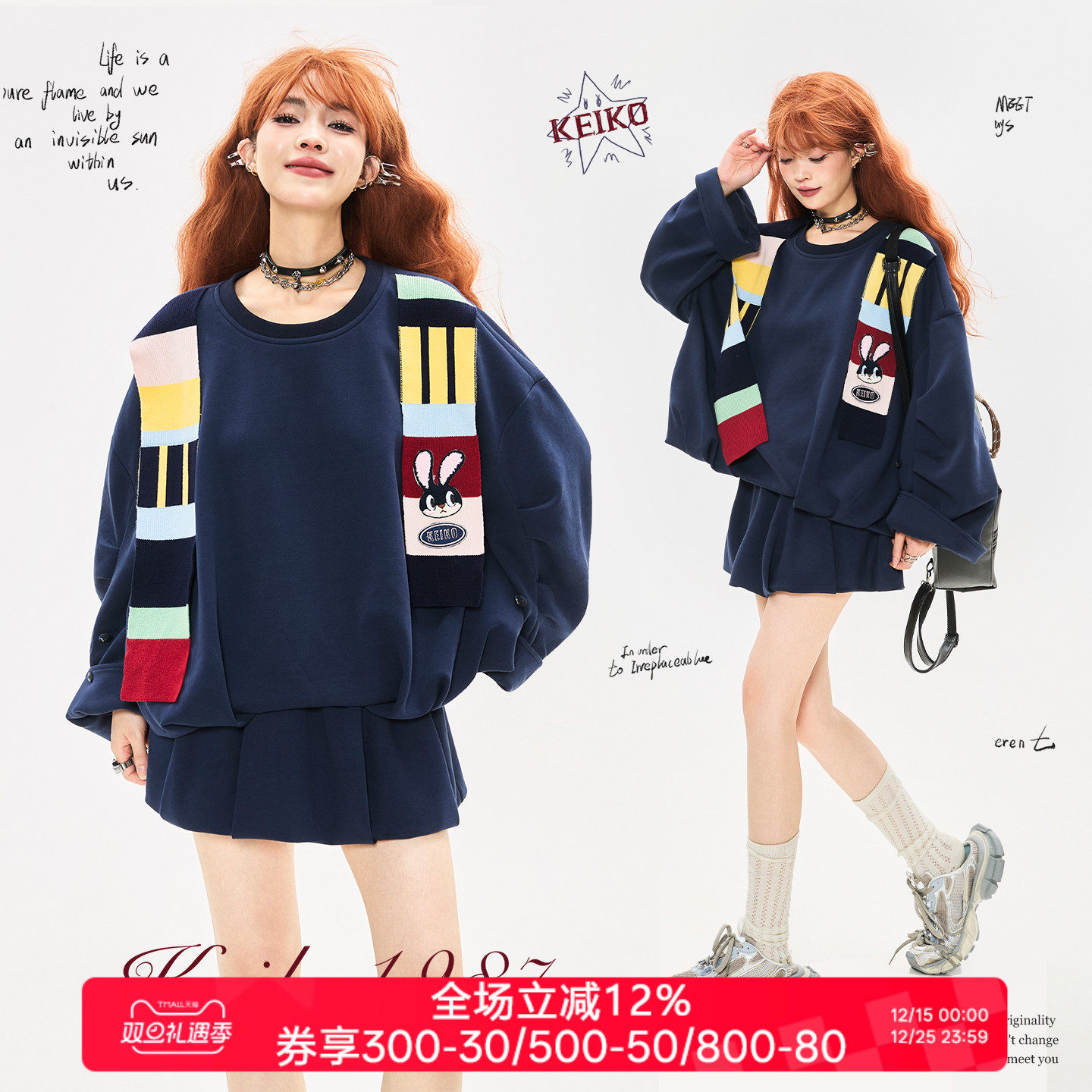 KEIKO 少女感穿搭撞色织条拼接卫衣女秋季宽松花苞型圆领套头上衣