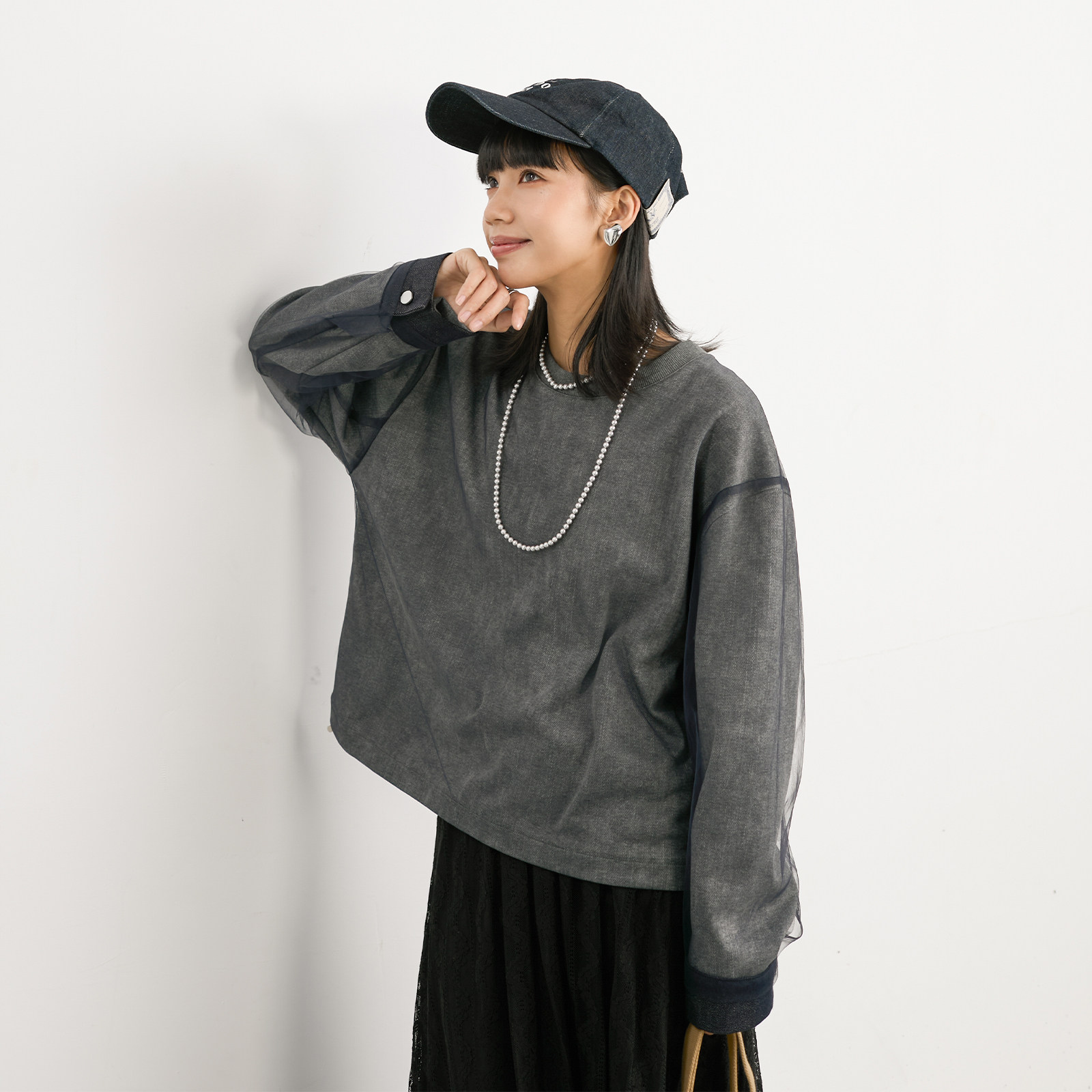 inkday日系轻复古网纱双层拼接卫衣女 圆领宽松晕染朦胧百搭上衣
