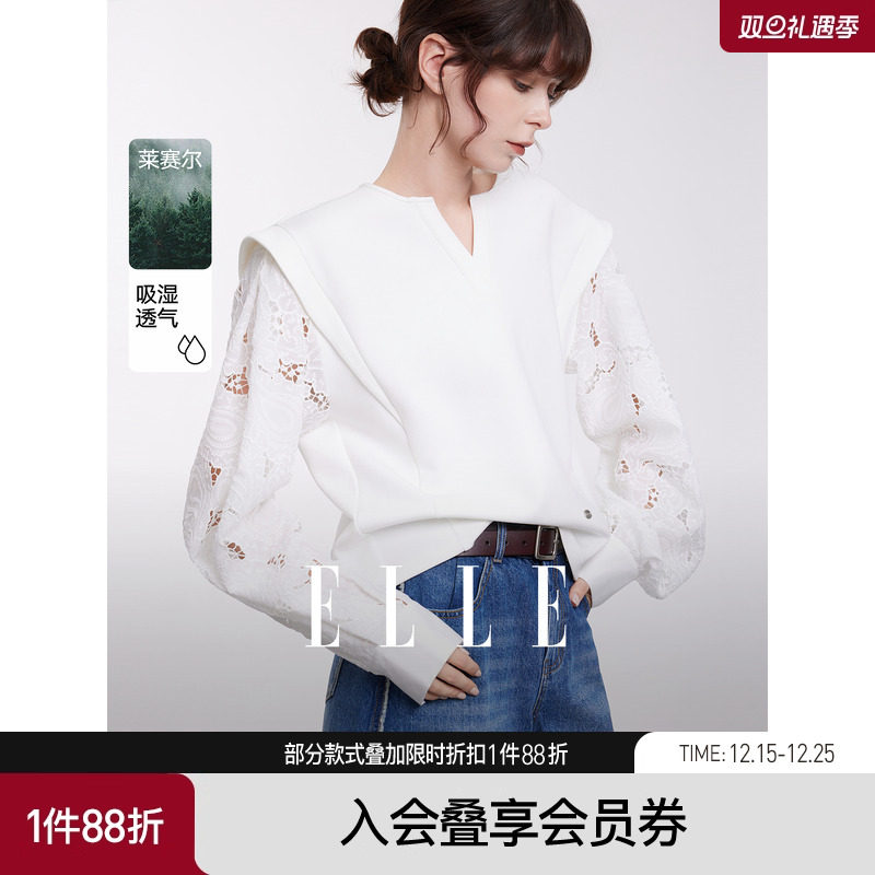 ELLE白色重工镂空绣花假两件拼接卫衣女2025秋新款莱赛尔天丝上衣