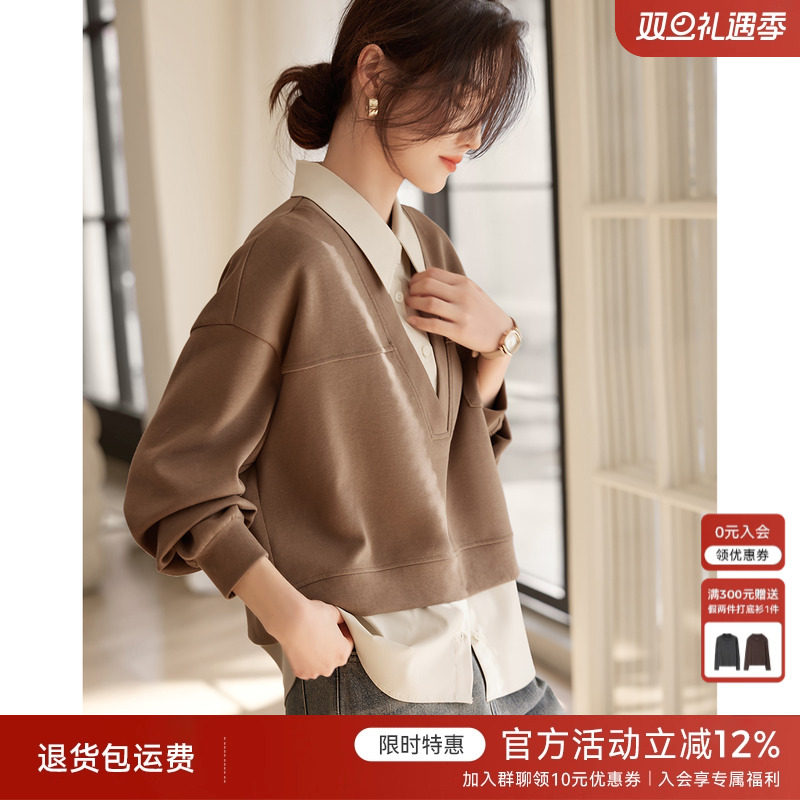 XWI欣未优雅假两件拼接卫衣女2025年春季棉质V型领口衬衫领上衣