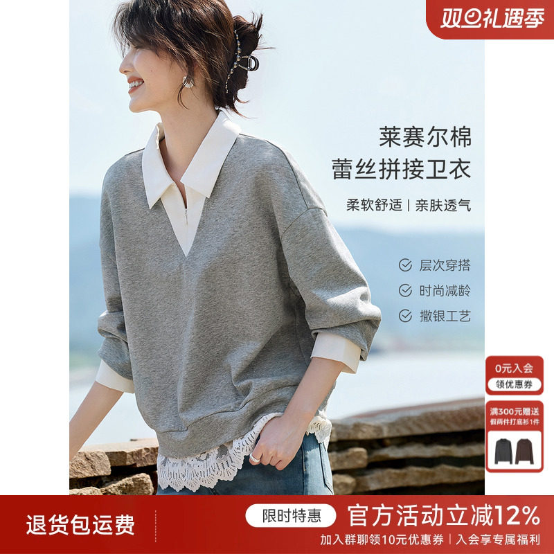 小C家 灰色卫衣女2025新款秋休闲宽松拼接蕾丝绣花刺绣设计感上衣