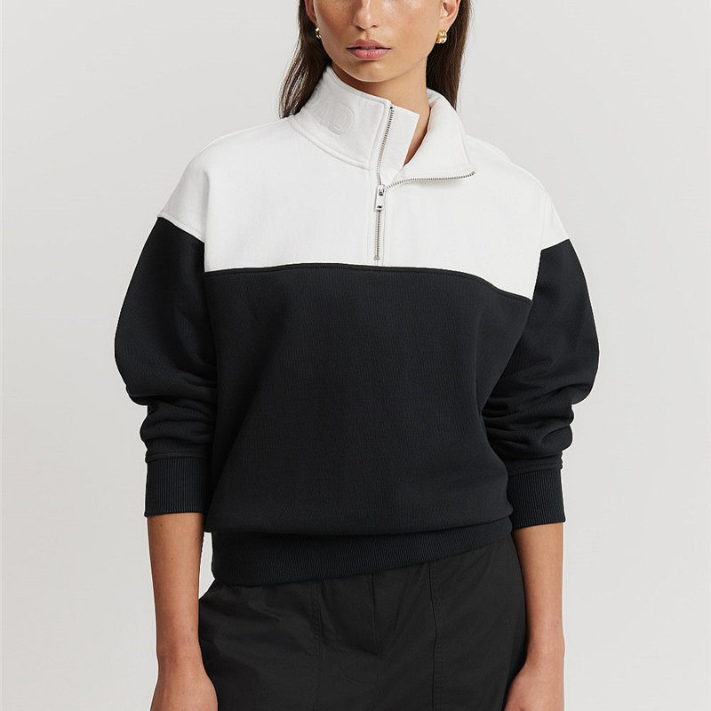 外贸纯元澳洲cr 全棉通勤风立领撞色拼接卫衣女宽松落肩袖半拉链