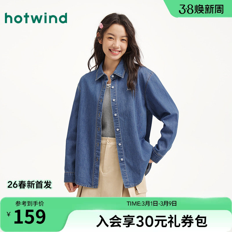 热风女士牛仔长袖衬衫上衣2026年春季新款休闲字母刺绣牛仔衬衣
