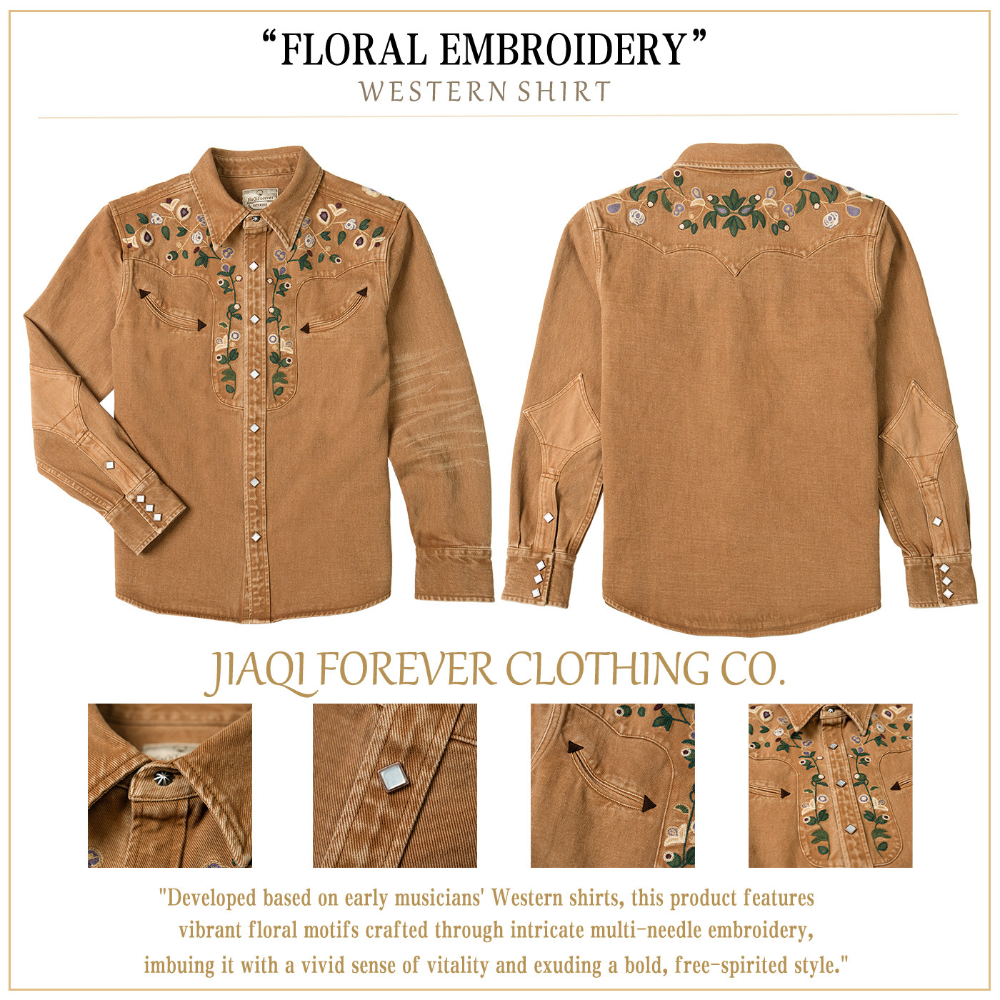 沾酱 毛线绣牛仔衬衫男 西部牛仔衬衣 男士长袖纯色休闲 咔叽复古