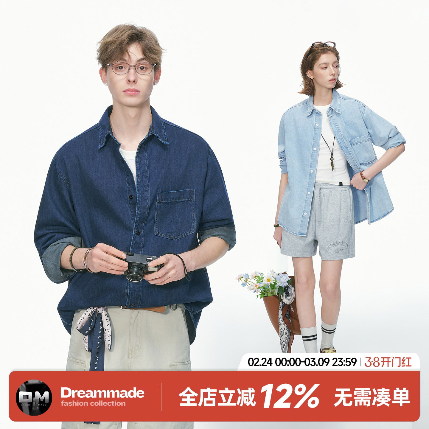 Dream made 美式高级感水洗牛仔衬衫男女春秋季情侣长袖衬衣外套