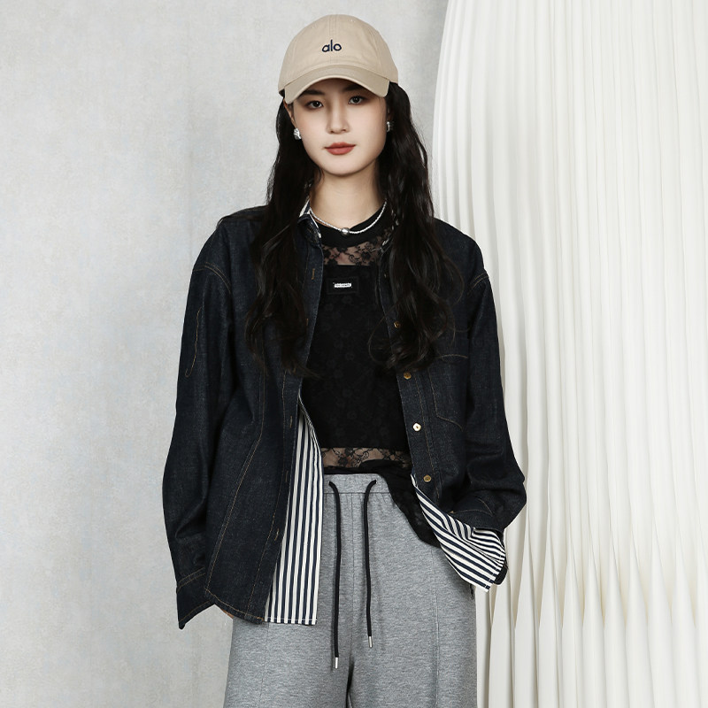 梵凯外套女2026春韩系复古深蓝色宽松时尚假两件长款牛仔衬衣外套