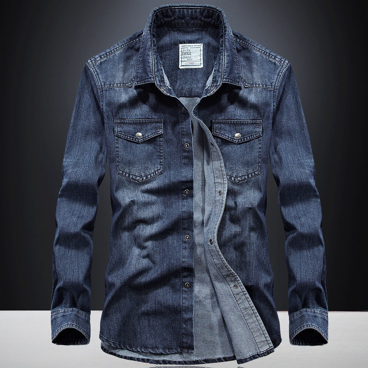 外贸跨境牛仔衬衣男款休闲纯色双口袋男式长袖衬衫denim shirt。
