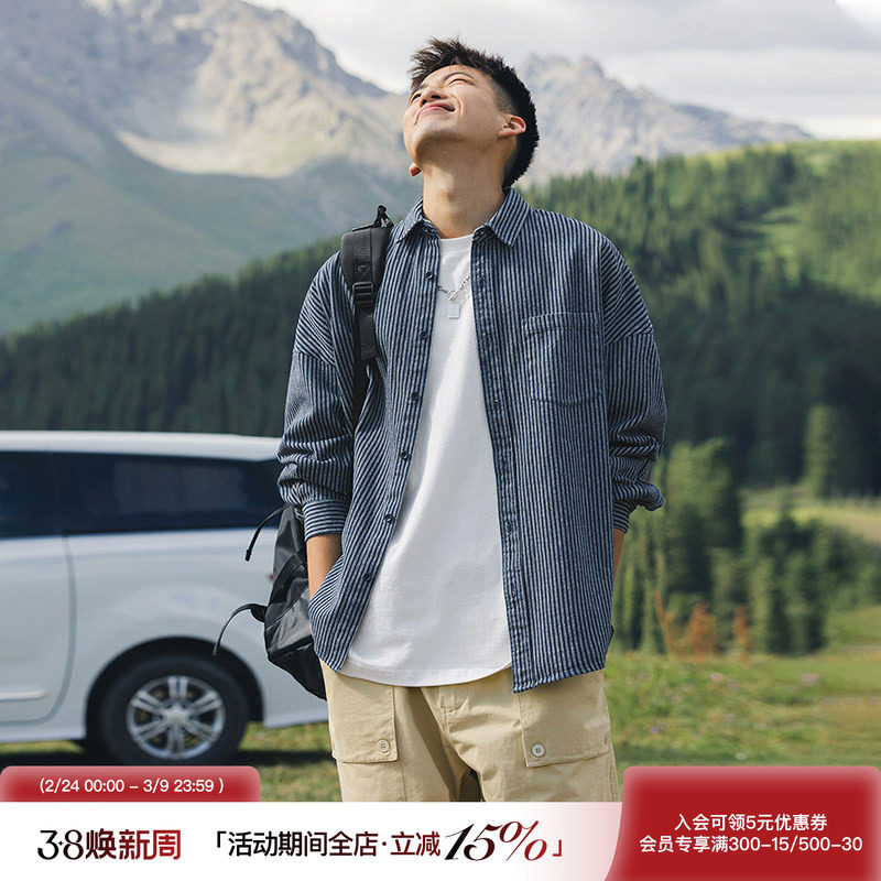 阿美咔叽工装衬衫男重磅全棉条纹日系复古风欧美合身长袖牛仔衬衣