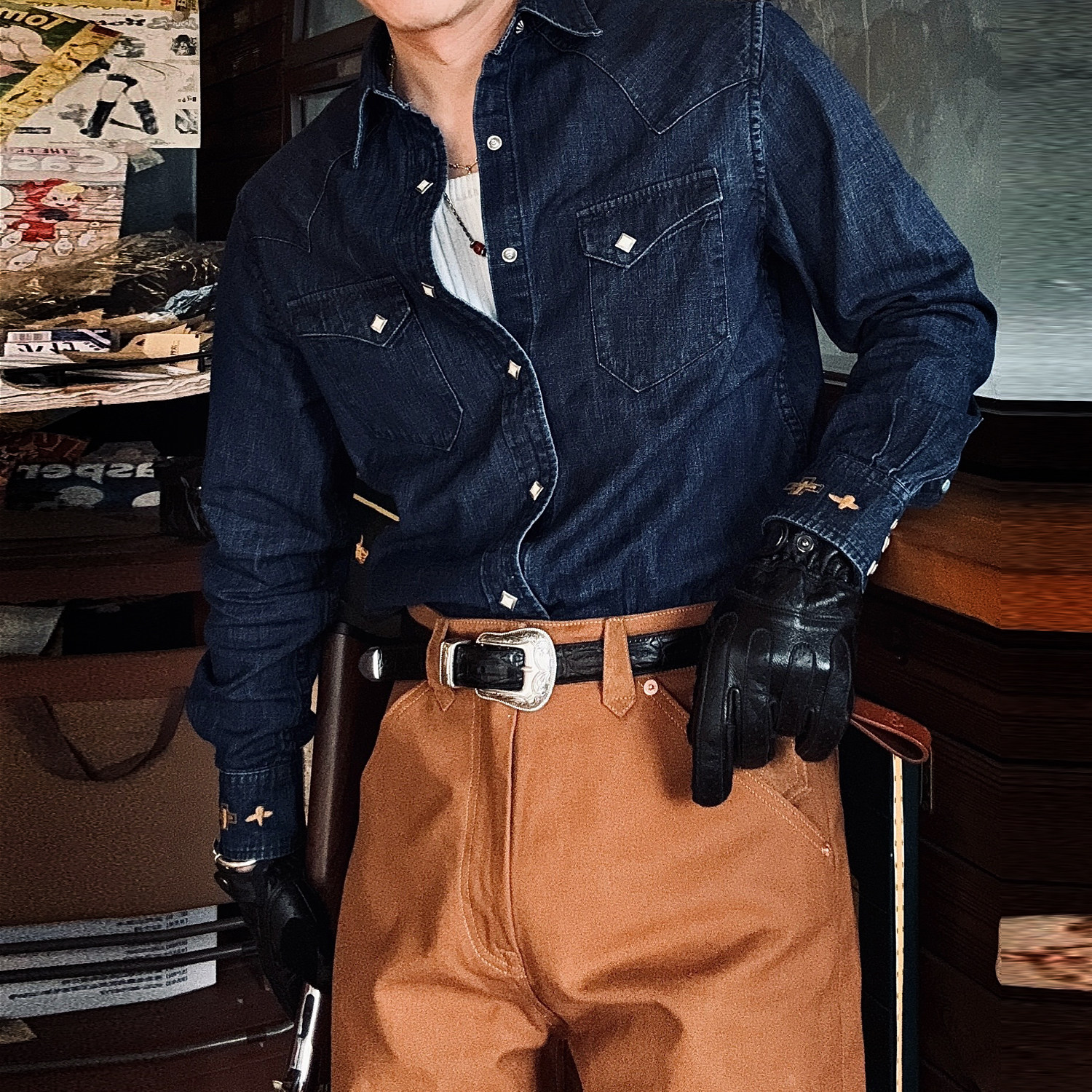 NON STOCK复古50s双贴袋长袖青年布款衬衫Chambray工装牛仔衬衣潮