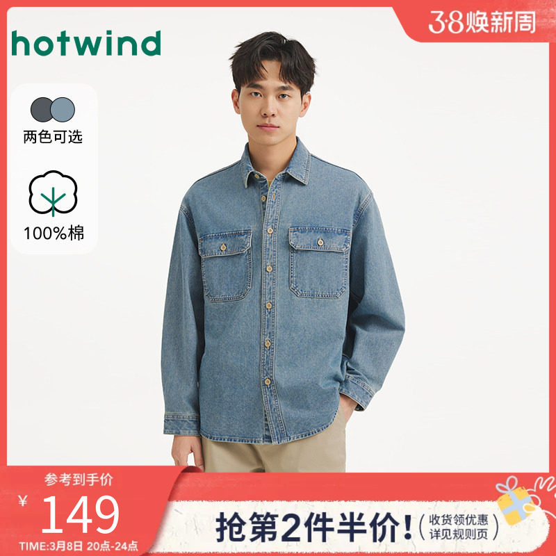 热风男士长袖牛仔衬衫2025年春季新款复古工装风牛仔衬衣打底衫
