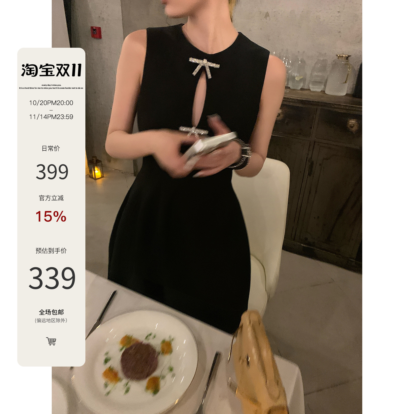 越韩小鱼 黑天鹅 法式千金风重工水钻蝴蝶结无袖黑色礼服连衣裙女