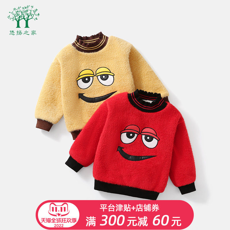宝宝冬季新款卡通插画加绒卫衣允儿妈女童秋冬加厚长袖儿童套头衫