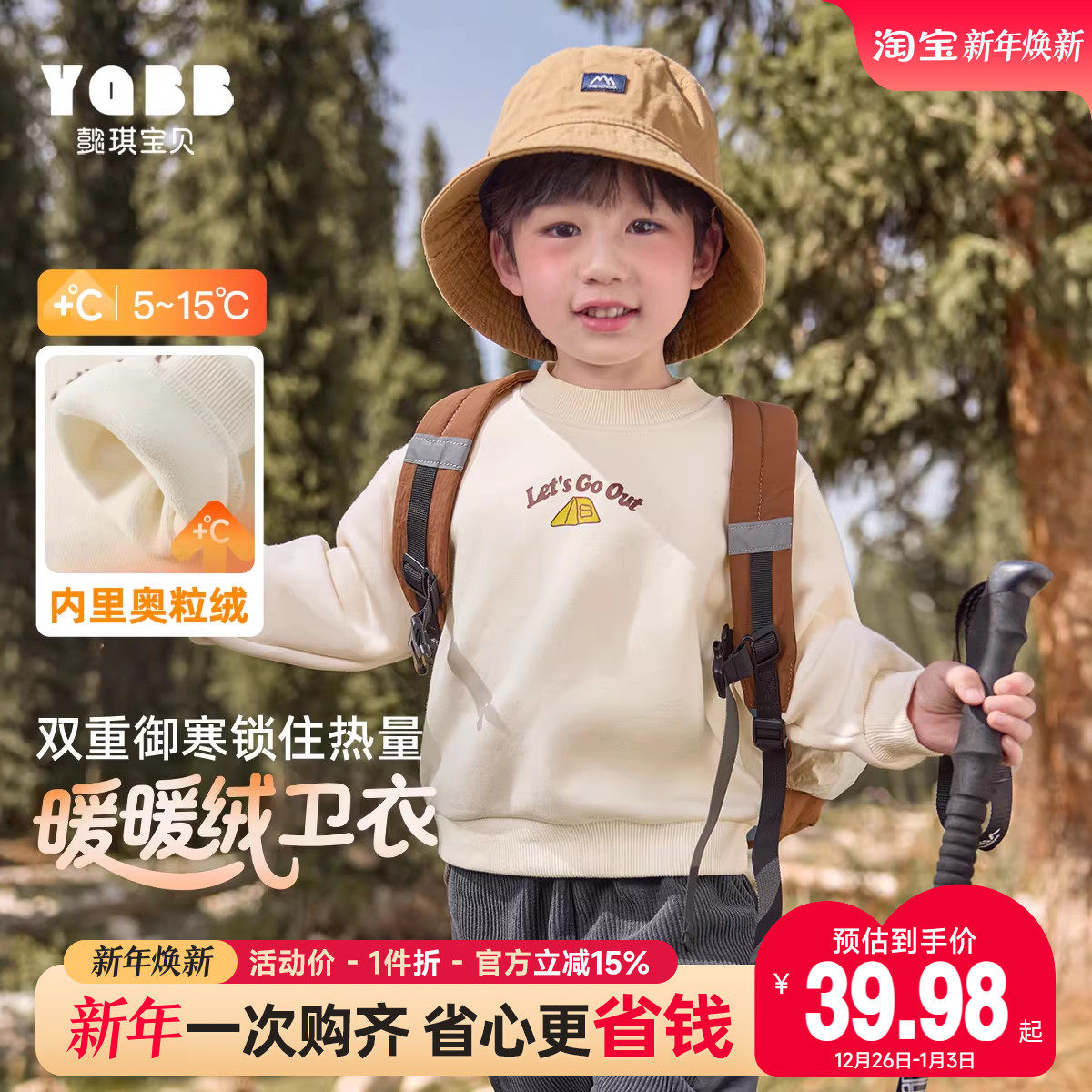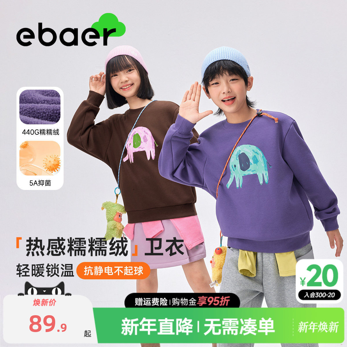EBAER儿童加绒圆领卫衣2025冬季新款男童女童保暖加厚冬装上衣潮