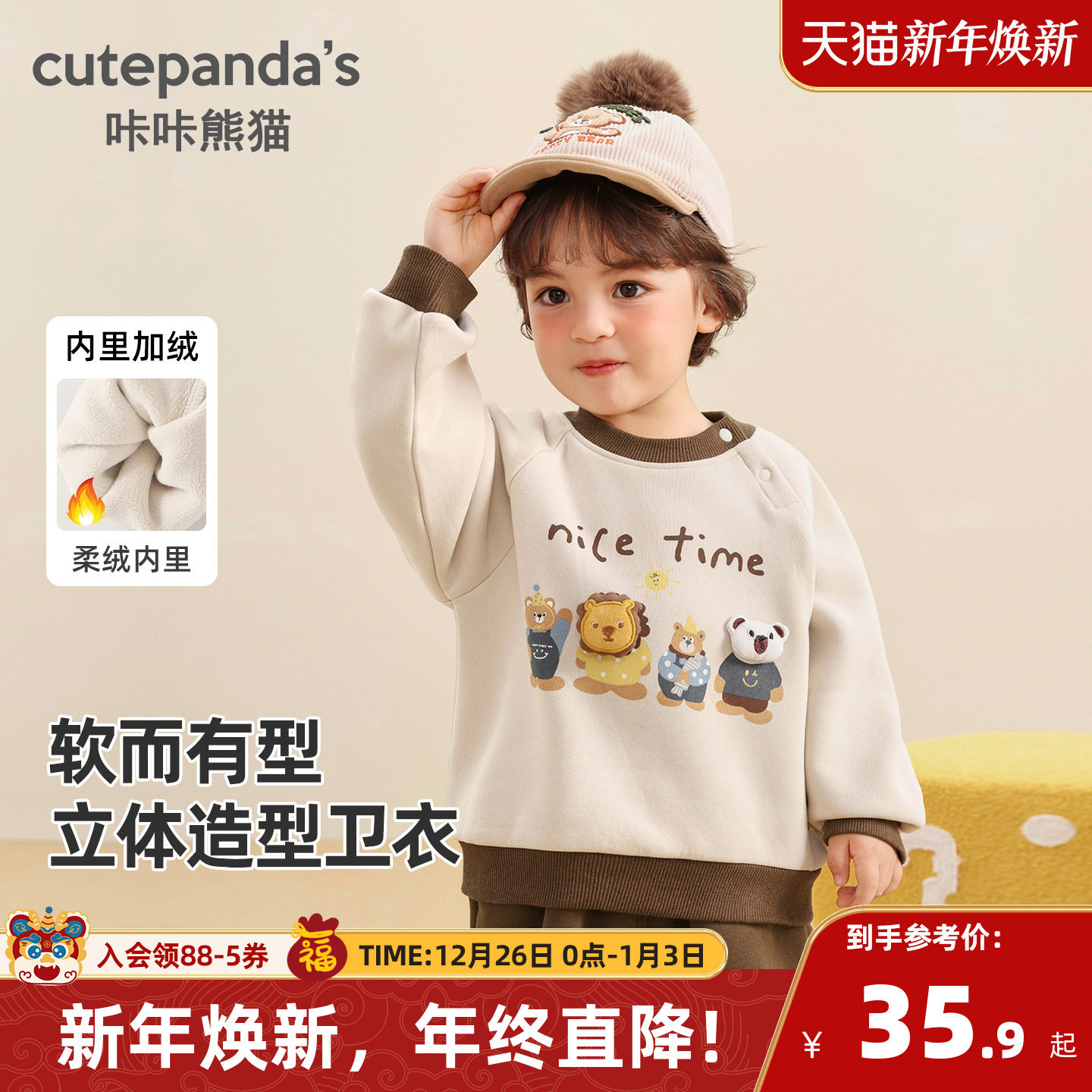 咔咔熊猫儿童加厚圆领卫衣婴儿加绒衣服冬装秋冬男童女童宝宝上衣