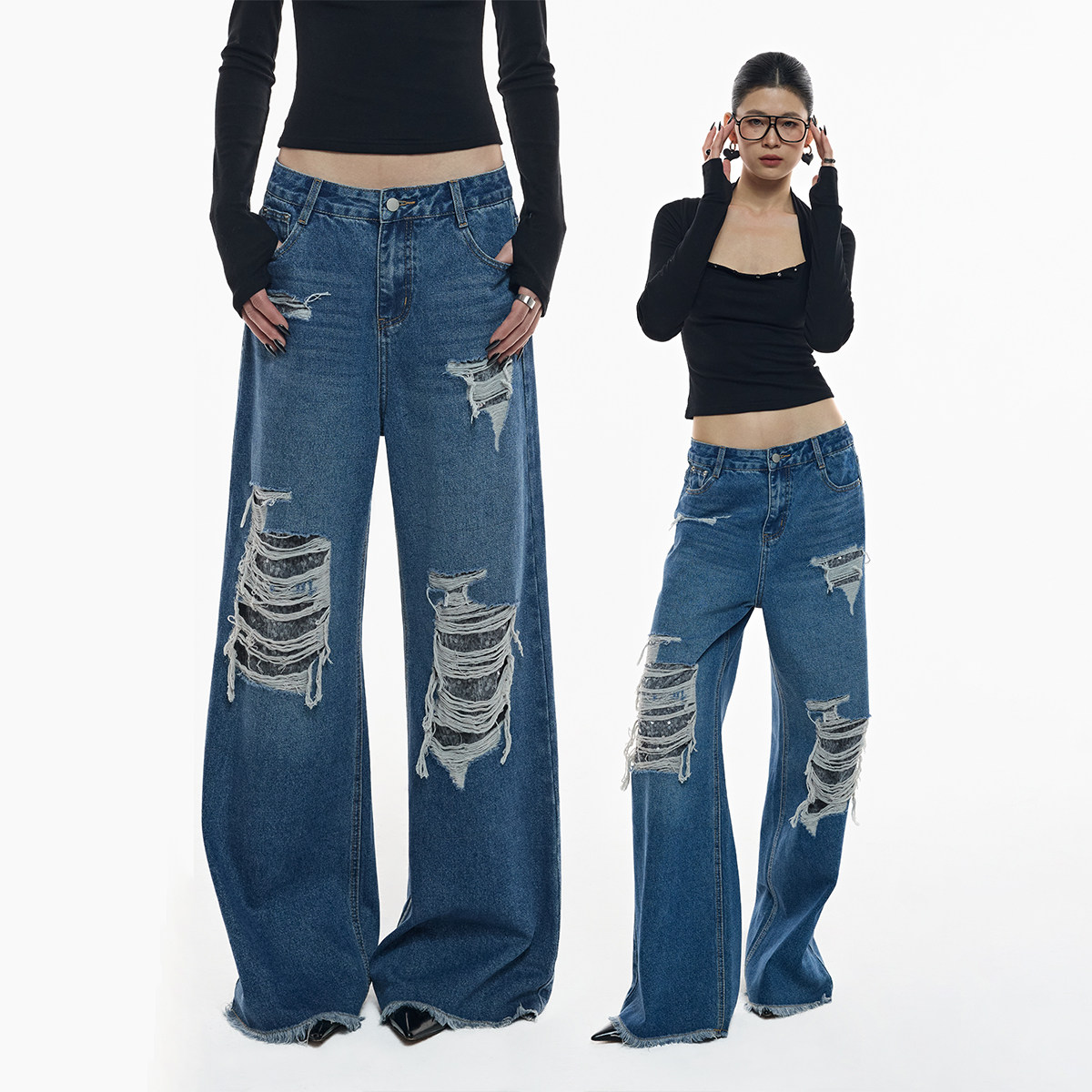 - 女裤牛仔裤宽松破洞